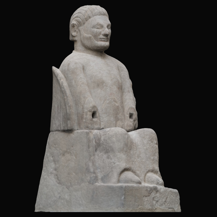 Limestone cinerary urn in the form of a man seated on a typical Etruscan chair, wearing a long tunic and shoes. Traces of red paint survive on the skin, and black on the hair and beard. The urn was carved in four pieces, the lower part hollowed out to contain ashes. Two arms once fitted into sockets at the elbows, but are now missing.